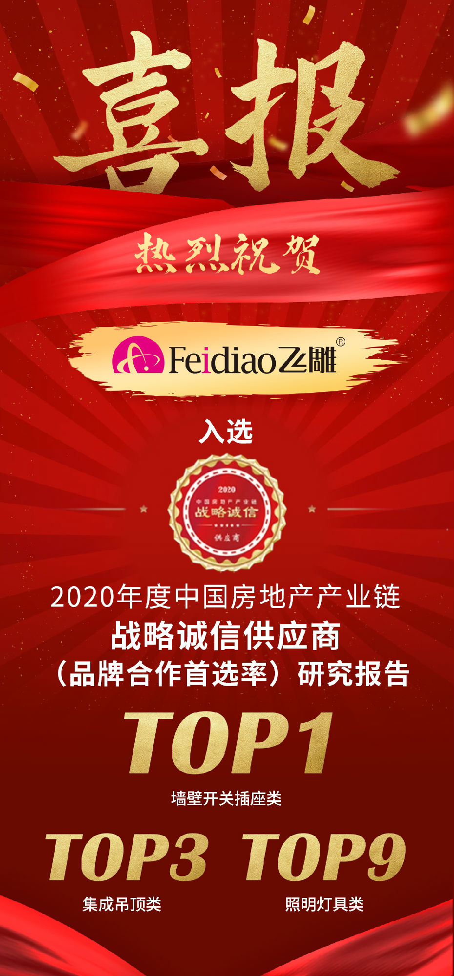 恭喜飞雕电器集团“墙壁开关插座类、集成吊顶类、照明灯具类”产品入选《2020年度中国房地产产业链战略合作商研究报告》。