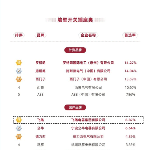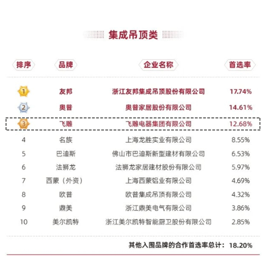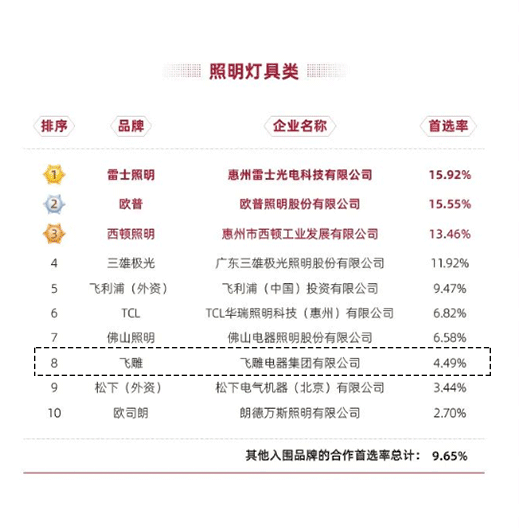 此次报告揭晓了房地产产业链战略诚信供应商首选率表现榜单,在墙壁开关插座类,飞雕电器实力上榜,品牌首选率位居第一(国产品牌),其中,集成吊灯类首选率位居TOP3,照明类首选率位居TOP8。从首选率数据可以看出,龙头房企对飞雕电器的企业诚信与品牌品质的高度赞誉与认可。