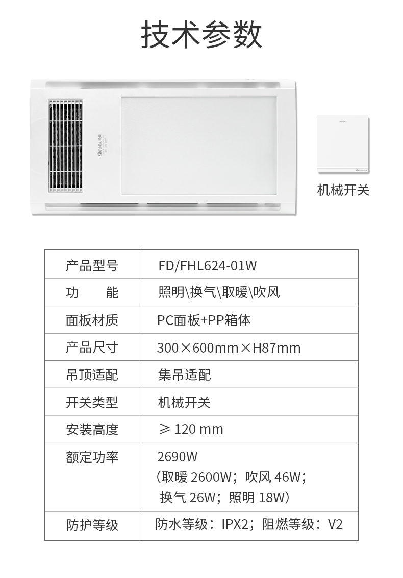 产品功能:照明/换气/吹风/制暖/机械开关
